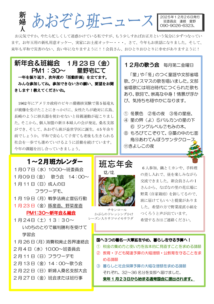 1962年にアメリカ政府のビキニ環礁核実験で第5福竜丸が被爆を受けたことにきっかけに、女性たちが絶対に広島、長崎のように核兵器を使わせないと母親運動が起こりました。そこから、個人加盟の新日本婦人の会が発足。桑名支部ができ、そして、あおぞら班が益世学区に誕生。45年余り前でしょうか。平和で安心して子育ても老後も生きられる社会を一歩でも進めていけるように活動を続けています。今年の課題を出し合っていきましょう。