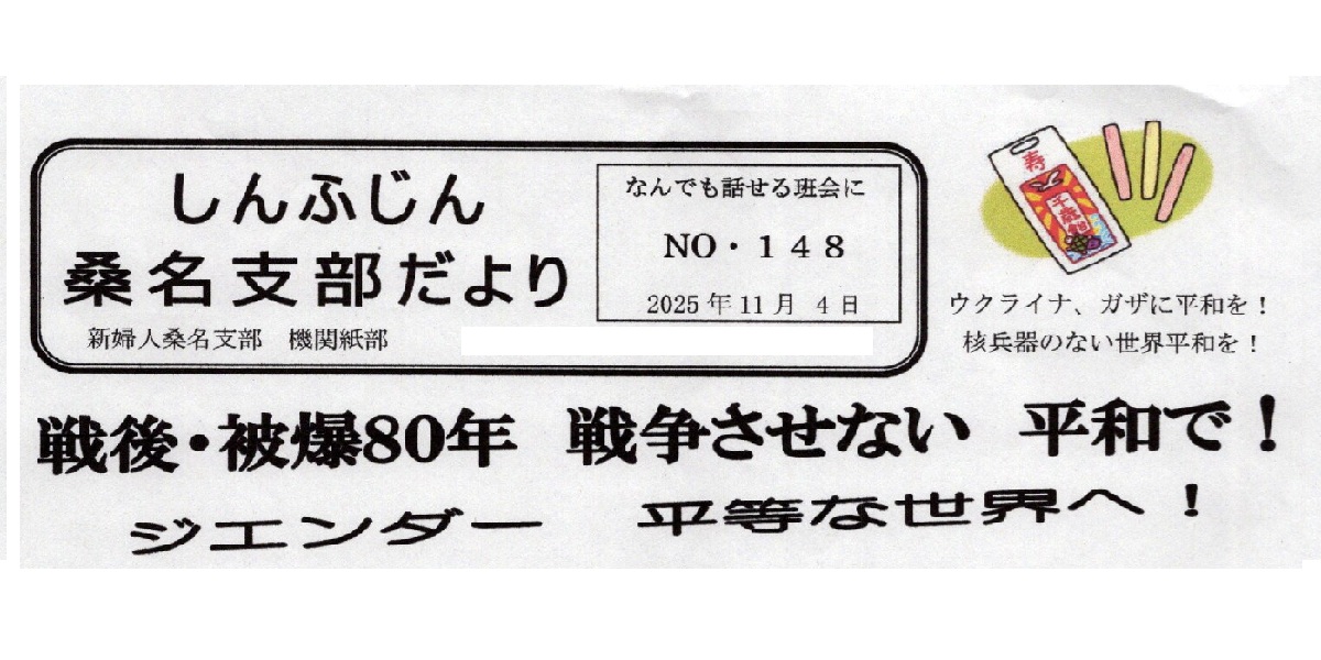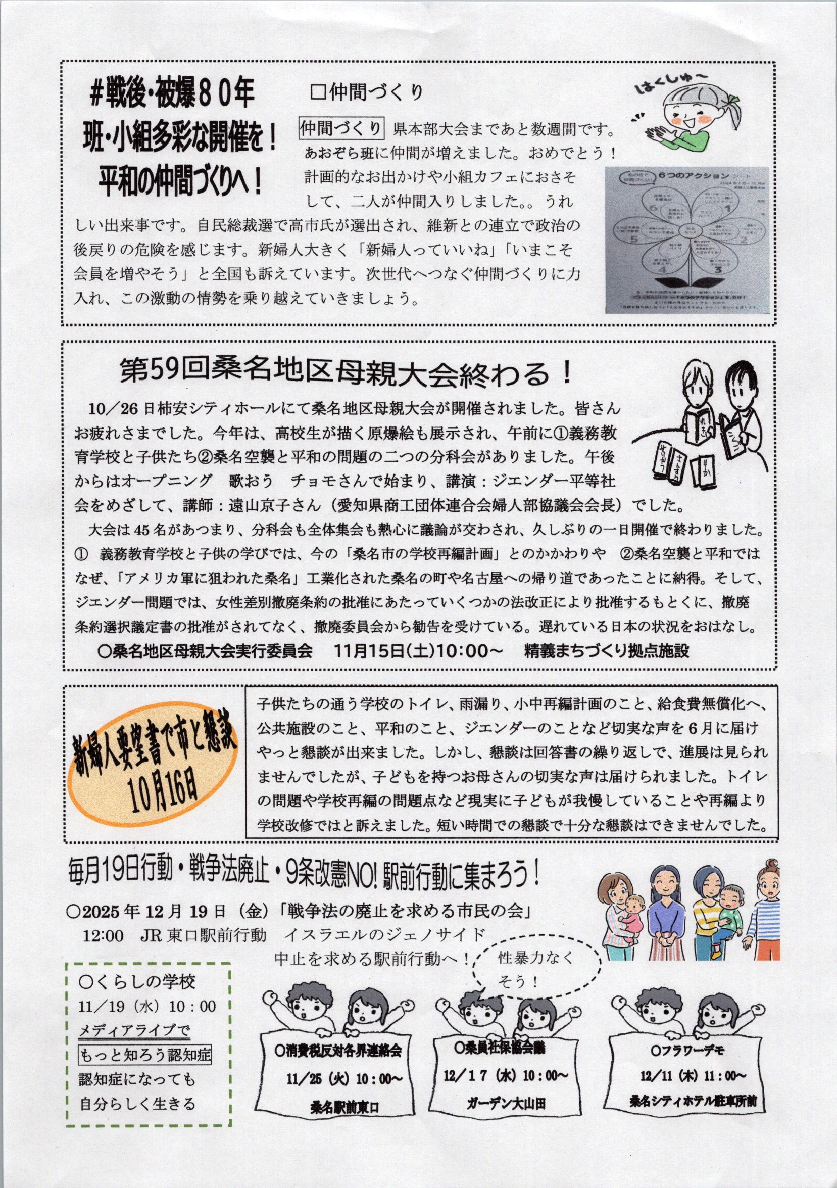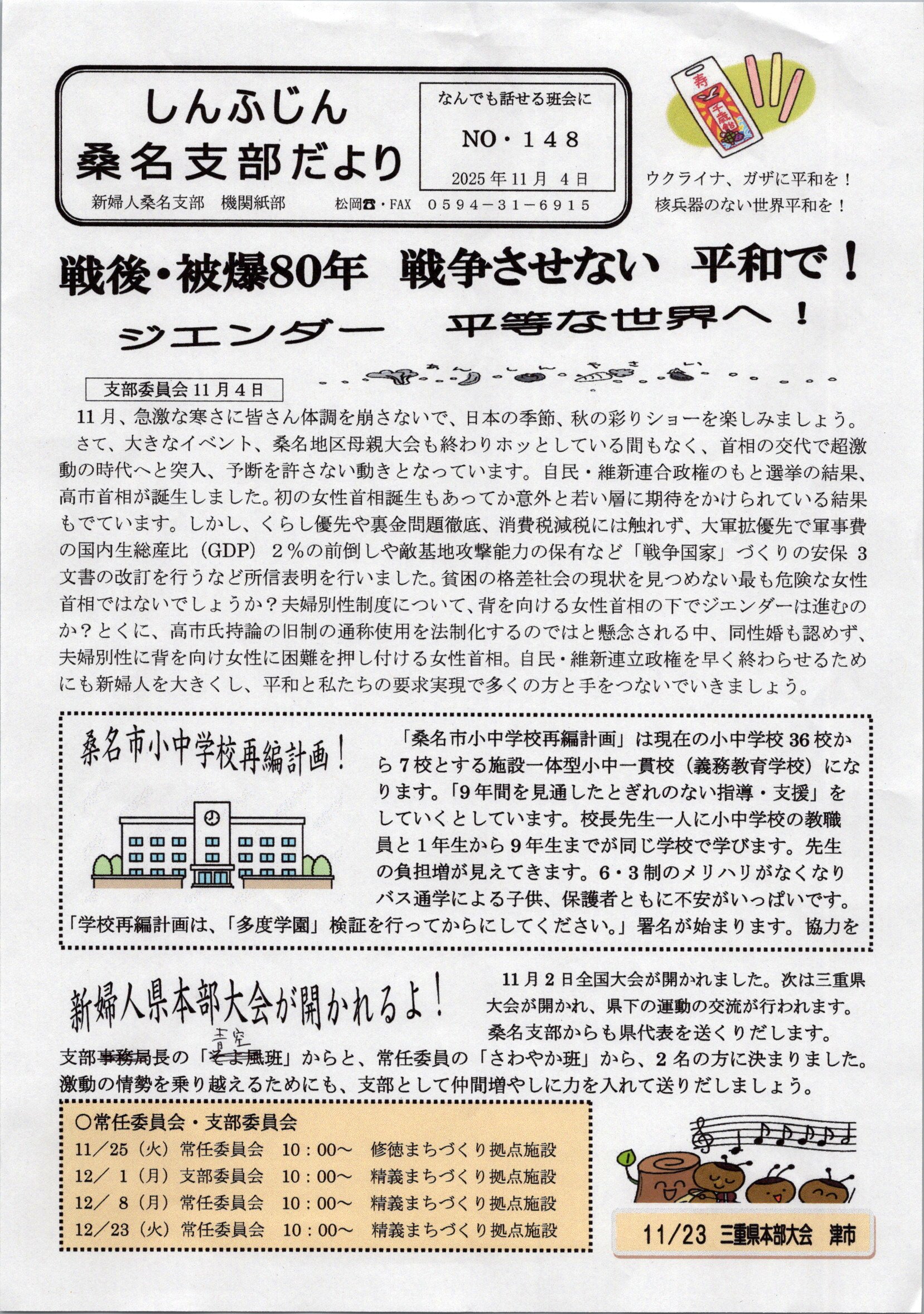 11月、急激な寒さに皆さん体調を崩さないで、日本の季節、秋の彩りショーを楽しみましょう。さて、大きなイベント、桑名地区母親大会も終わりホッとしている間もなく、首相の交代で超激動の時代へと突入、予断を許さない動きとなっています。