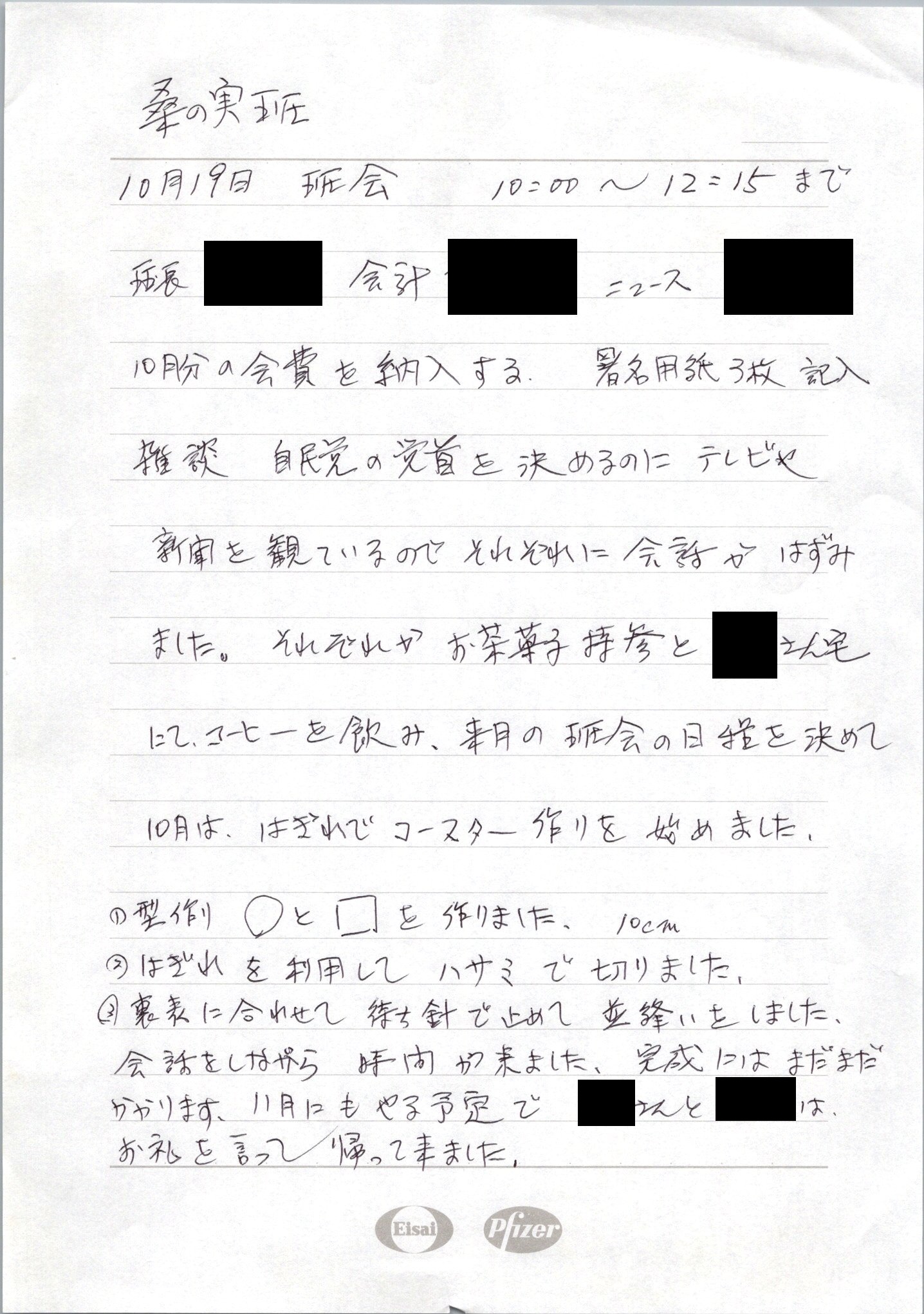それぞれやお茶菓子持参と〇〇さん宅にて、コーヒーを飲み、来月の班会の日程を決めて