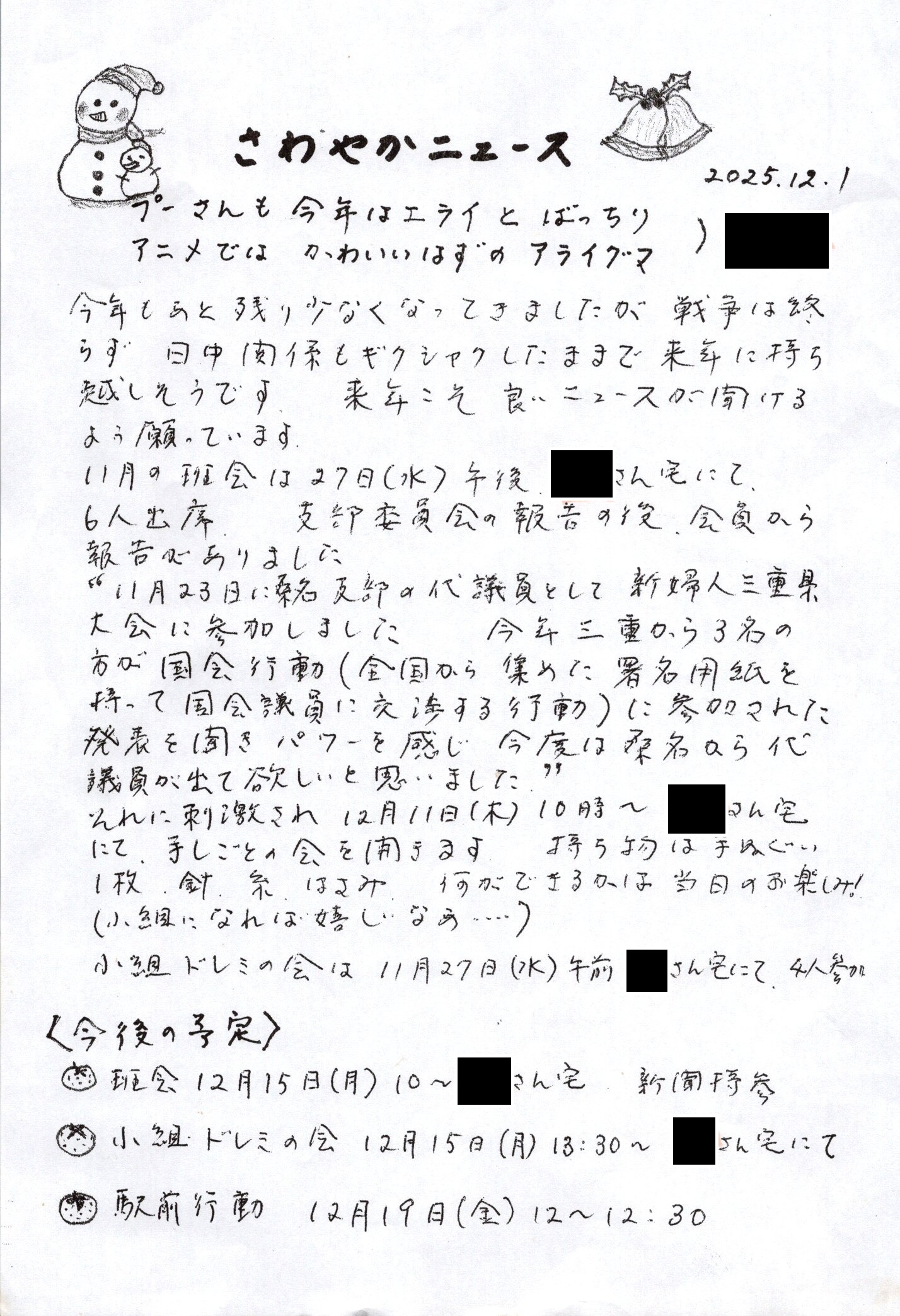 • 班会 12月15日(月)10~ 〇〇さん宅 新聞持参